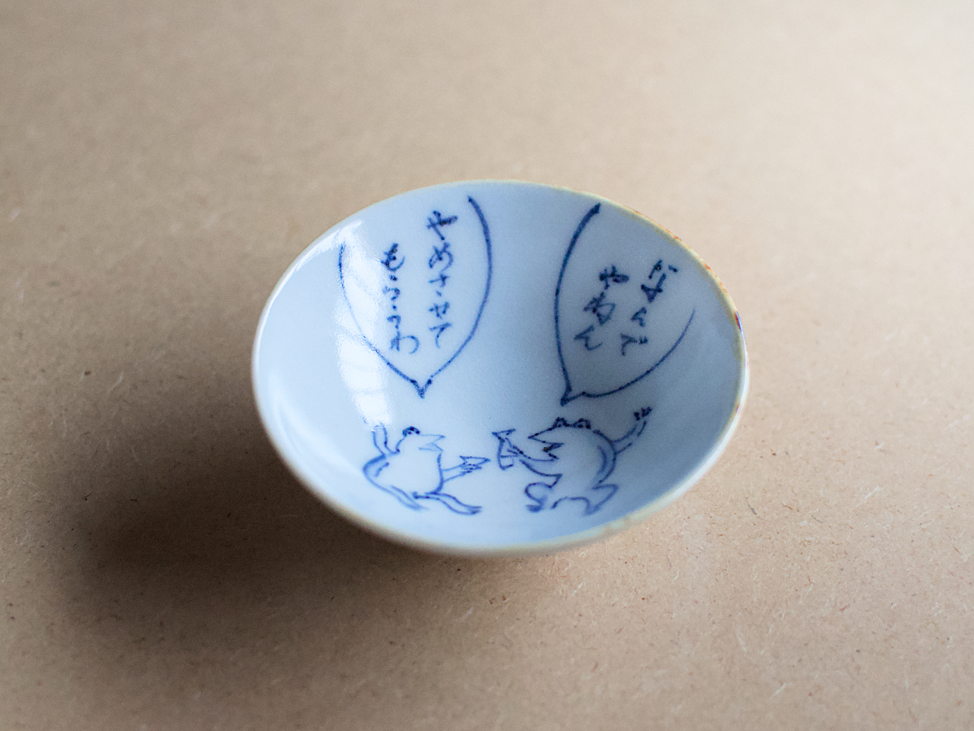 艶やかな風吹く柳小路、酒呑みを誘って揺れるのは「そば 酒 まつもと」の暖簾。季節の酒肴と燗酒に溺れ、〆の蕎麦で堕ちてゆく・・・。そんな魅惑のカウンターへ、小間絵のコロ茶碗を誂えさせていただきました。北斎を写した蕎麦っ喰いが、白ワイン越しに蕎麦を手繰ります。